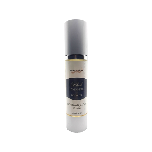 Xotic Envi Blush Zinfandel Body Oil make your skin blush with the soulful scents of wild blueberry, bergamot, blackberry, vanilla cream, raspberry sugar, and buttermilk musk. Made from organic “Jamrai” vineyard grapes located in Napa, CA. Est. 2021.
