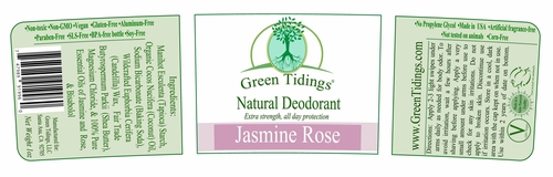- Green Tidings All Natural Deodorant is: Non-toxic, Vegan, Gluten-free, Corn-free, Soy-free, Paraben-free, SLS-free, Aluminum-free, Propylene-glycol free, Fragrance-Free, Petroleum and Petrolatum-free, Pthalate-free, Paraffin-free, Mineral Oil-free, no artificial colors, No Silicone Oil, No Menthol, Phenol, or Salicylic Acid, Certified Cruelty-free by Leaping Bunny, & made in a solar powered facility.