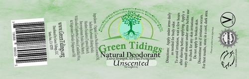 • Green Tidings All Natural Deodorant is: Non-toxic, Vegan, Gluten-free, Corn-free, Soy-free, Paraben-free, SLS-free, Aluminum-free, Propylene-glycol free, Fragrance-Free, Petroleum and Petrolatum-free, Pthalate-free, Paraffin-free, Mineral Oil-free, no artificial colors, No Silicone Oil, No Menthol, Phenol, or Salicylic Acid, Certified Cruelty-free by Leaping Bunny, & made in a solar powered facility.