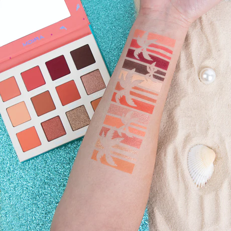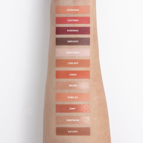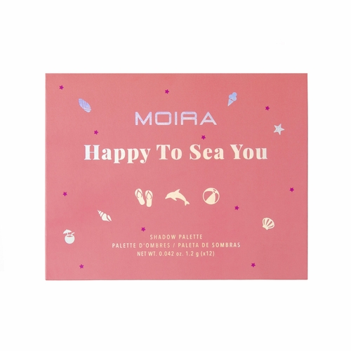Take beach vacation with HAPPY TO SEA YOU. This palette features sun-drenched shades, from glistening rose gold and copper to flaming red and peach. Velvety pigmented shades offer effortless day look to irresistible night look.