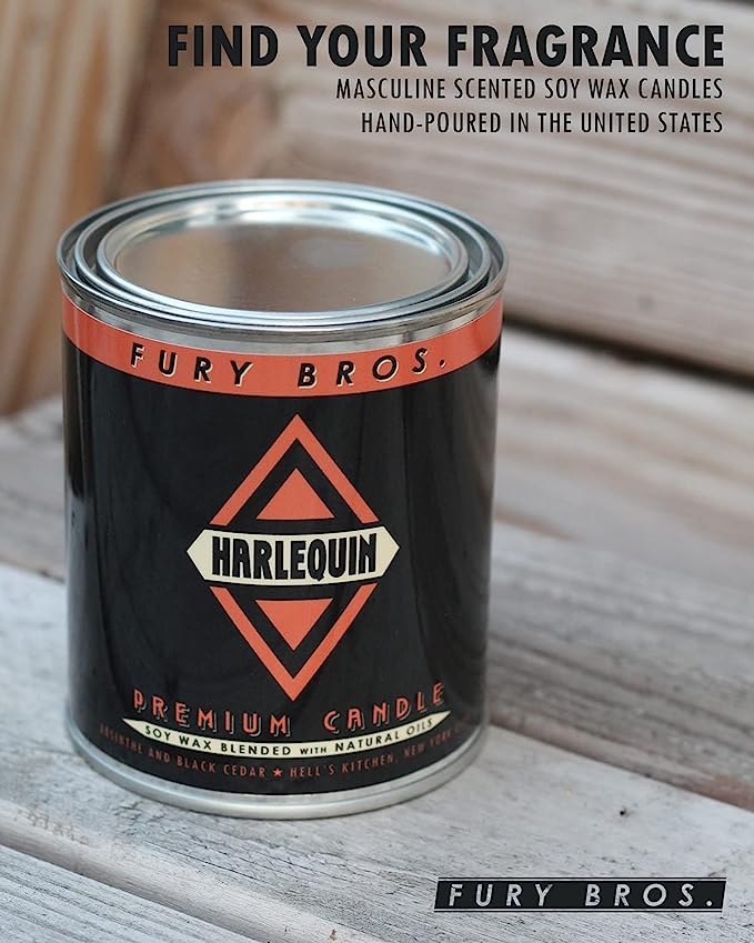 Experience the great outdoors with Fury Bros. Pemium scented candles, which are hand-poured in the USA using vintage-inspired fragrances. Harlequin scented candle for men, designed to bring to life the essence of the green fairy. The candle boasts a luxurious scent of absinthe, blended with a black cedar bouquet and deep anise notes to create the perfect ambiance for a mysterious night. These candles are made using fine soy wax and natural oils, making them eco and vegan-friendly and safe to breathe. Fury Bros candles are also free of stearic acid or beeswax, making them a perfect choice for vegans, and they are not tested on animals.