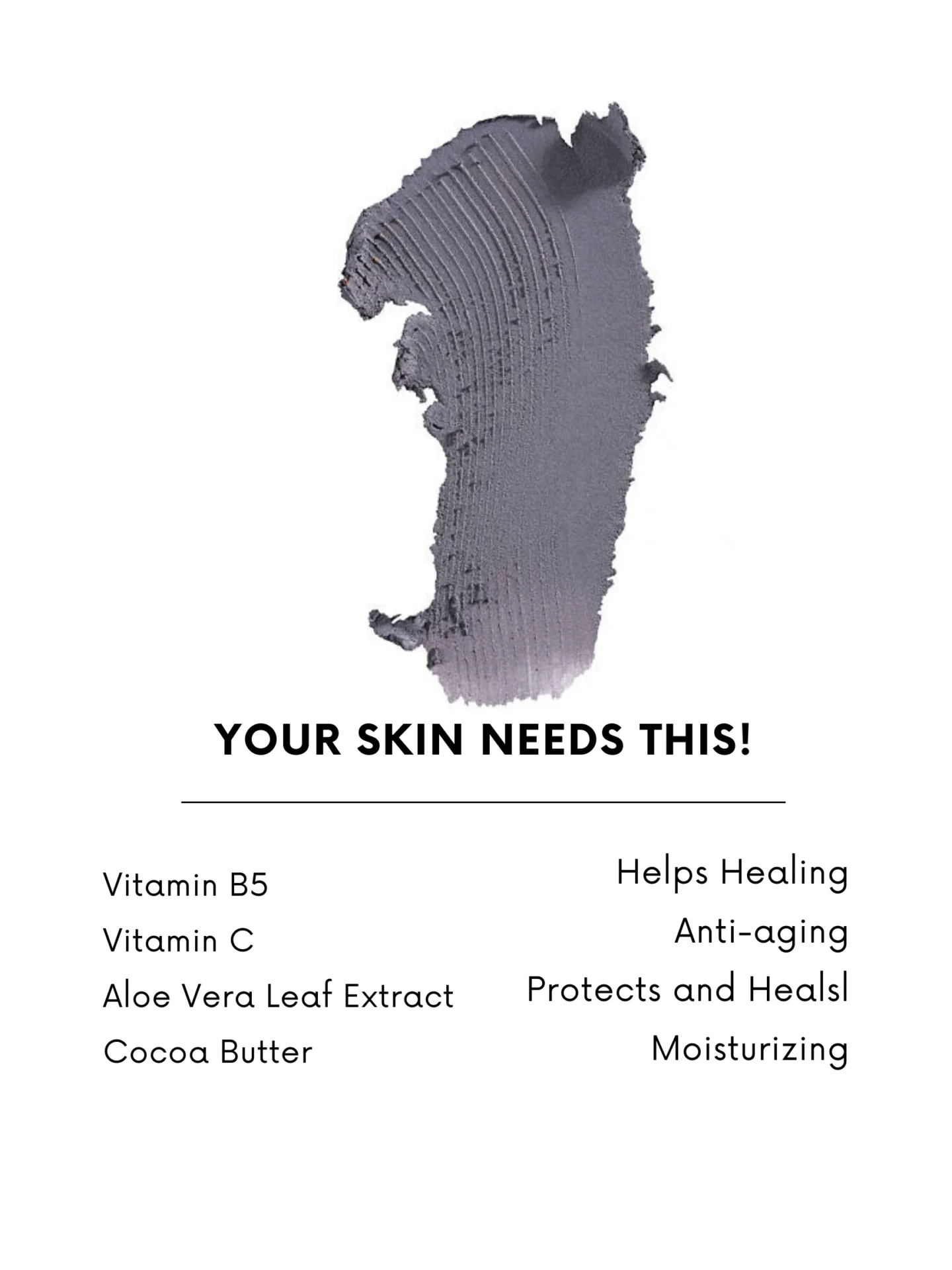 Aqua (Deionized Water), Aloe Barbadensis Leaf Juice (Organic Aloe), Kaolin, Helianthus Annuus Seed Oil (Organic Sunflower), Glyceryl Stearate, Glycerin, Pumice, Charcoal Powder (Bamboo Charcoal Powder), Ethylhexyl Palmitate, Organic Cocos Nucifera Oil (Coconut Oil), Beeswax, Dimethyl Sulfone (MSM), Magnesium Aluminum Silicate, Sodium Magnesium Silicate, Theobroma Cacao (Cocoa) Seed Butter, Cetyl Alcohol, Potassium Stearate, Simmondsia Chinensis Seed Oil (Organic Jojoba), Cellulose Gum, Citrus Limon Fruit Oil (Lemon), Sodium Ascorbyl Phosphate (Vitamin C), Eucalyptus Globulus Leaf Oil (Eucalyptus), Ethylhexylglycerin, Eugenia Caryophyllus Bud Oil (Clove), Juniperus Communis Fruit Extract (Organic Juniper), Hamamelis Virginiana Water (Witch Hazel), Capsicum Annuum Extract (Organic Cayenne), Spirulina Maxima Extract (Spirulina), Macrocystis Pyrifera (Kelp) Extract, Panthenol (Vitamin B5), Vitis Vinifera Seed Oil (Grapeseed), Cellulose Gum, Sodium Carbomer, Phenoxyethanol, Ethylhexylglycerin.