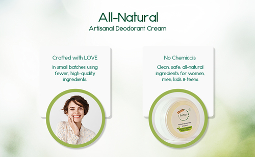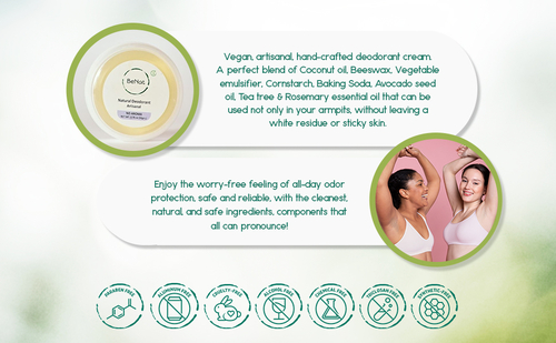 A perfect blend of just 8 simple and effective natural ingredients: Organic coconut oil, Beeswax, Vegetable emulsifier, Avocado oil, Cornstarch, Baking Soda and food-grade tea tree and rosemary essential oil, makes a clear formula, a cream that glides on smooth without leaving a white residue or sticky armpits and most important will not clog underarm pores, no harsh chemicals or toxic ingredients.