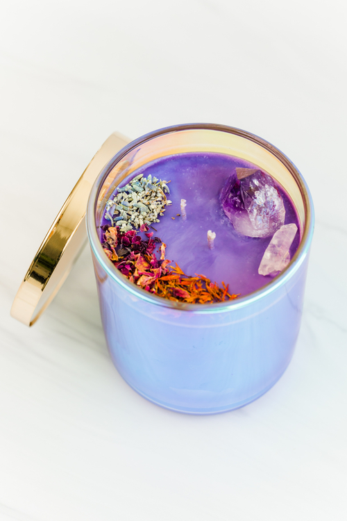 Soy, Hemp-derived CBD, Rose, Lavender, Safflower petals, Amethyst crystal, Quartz crystal
