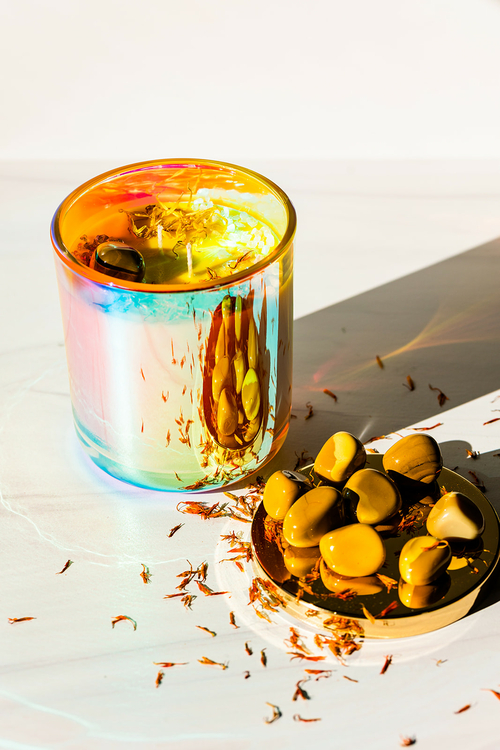Natural crystals are embedded into the wax, revealed as you burn your candle.